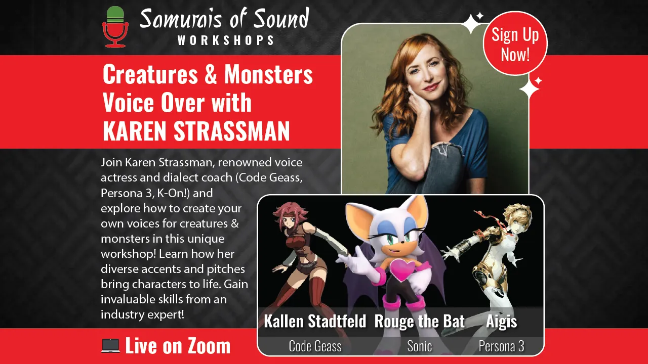 Join Karen Strassman, renowned voice actress (Code Geass, Persona 3, K-On!), for an exclusive Anime Dubbing Masterclass! Master authentic performances, emotional depth, and precise lip-syncing with expert industry techniques and hands-on coaching. Don’t miss this chance to level up your dubbing skills! Join Karen live on Zoom for this interactive workshop from Samurais of Sound!