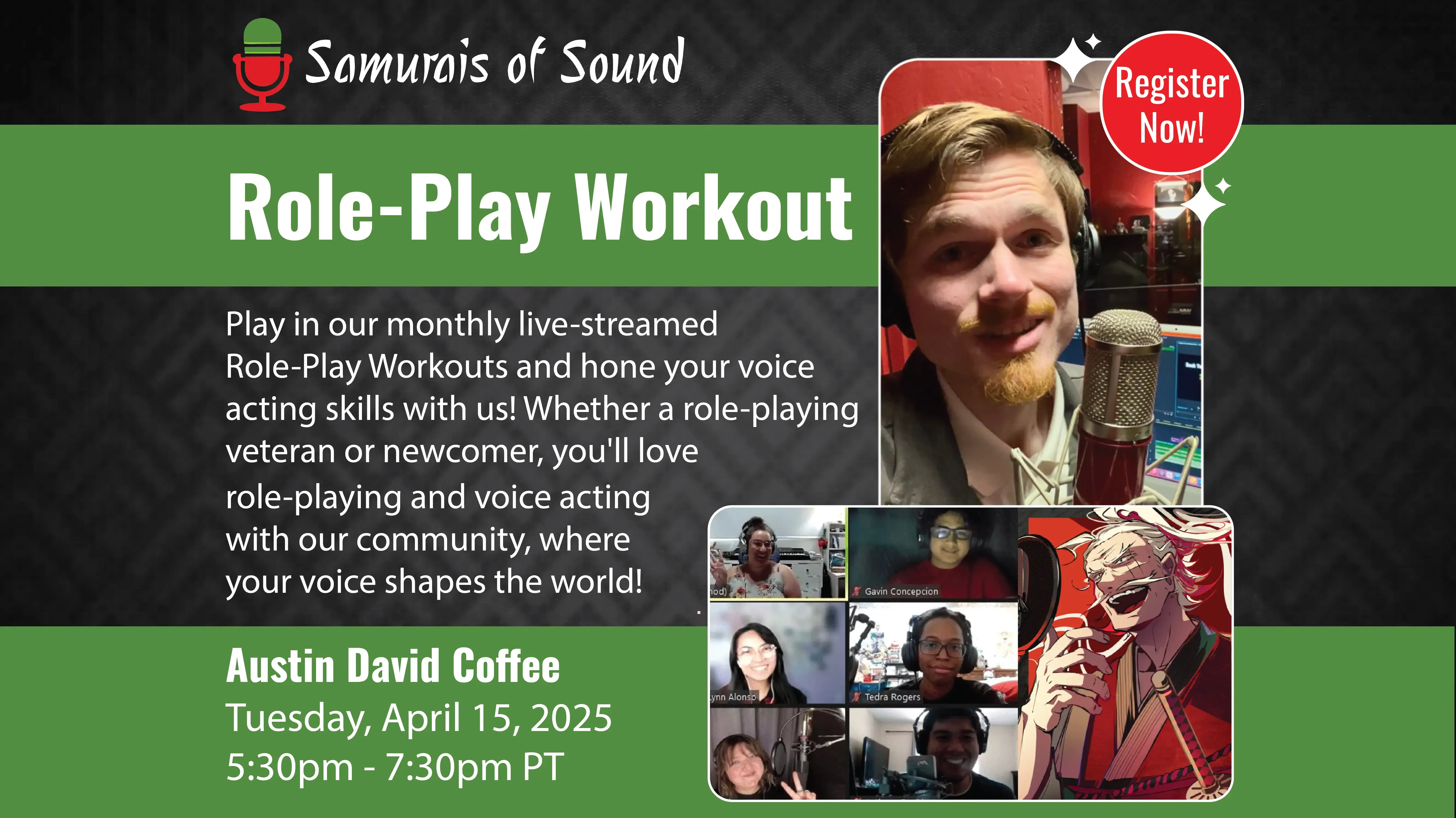 Play in our monthly live-streamed Role-Play Workouts and hone your voice acting skills with us! Get your voice heard by popular professional voice actors and casting directors in the anime and game space. Whether a role-playing veteran or newcomer, you'll love role-playing and voice acting with our community, where your voice shapes the world!