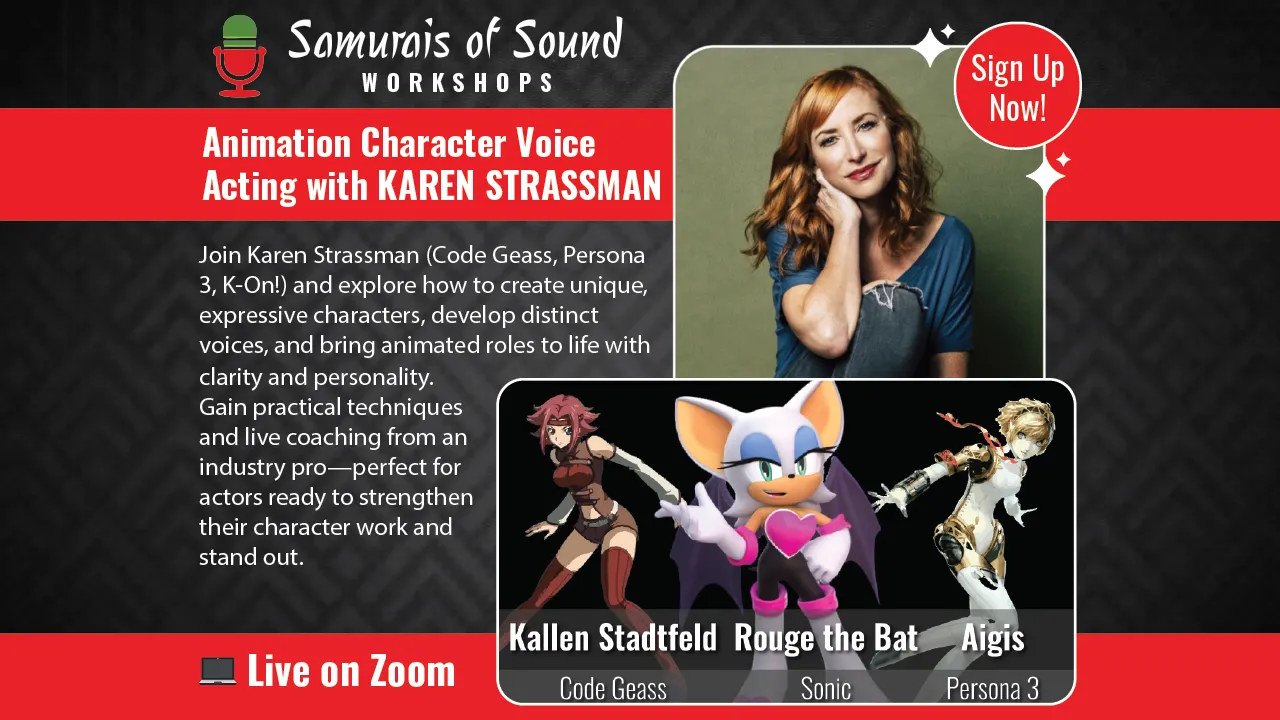 Join Karen Strassman (Code Geass, Persona 3, K-On!) for a dynamic Animation Character Voice Acting Workshop! Explore how to create unique, expressive characters, develop distinct voices, and bring animated roles to life with clarity and personality. Gain practical techniques and live coaching from an industry pro—perfect for actors ready to strengthen their character work and stand out.